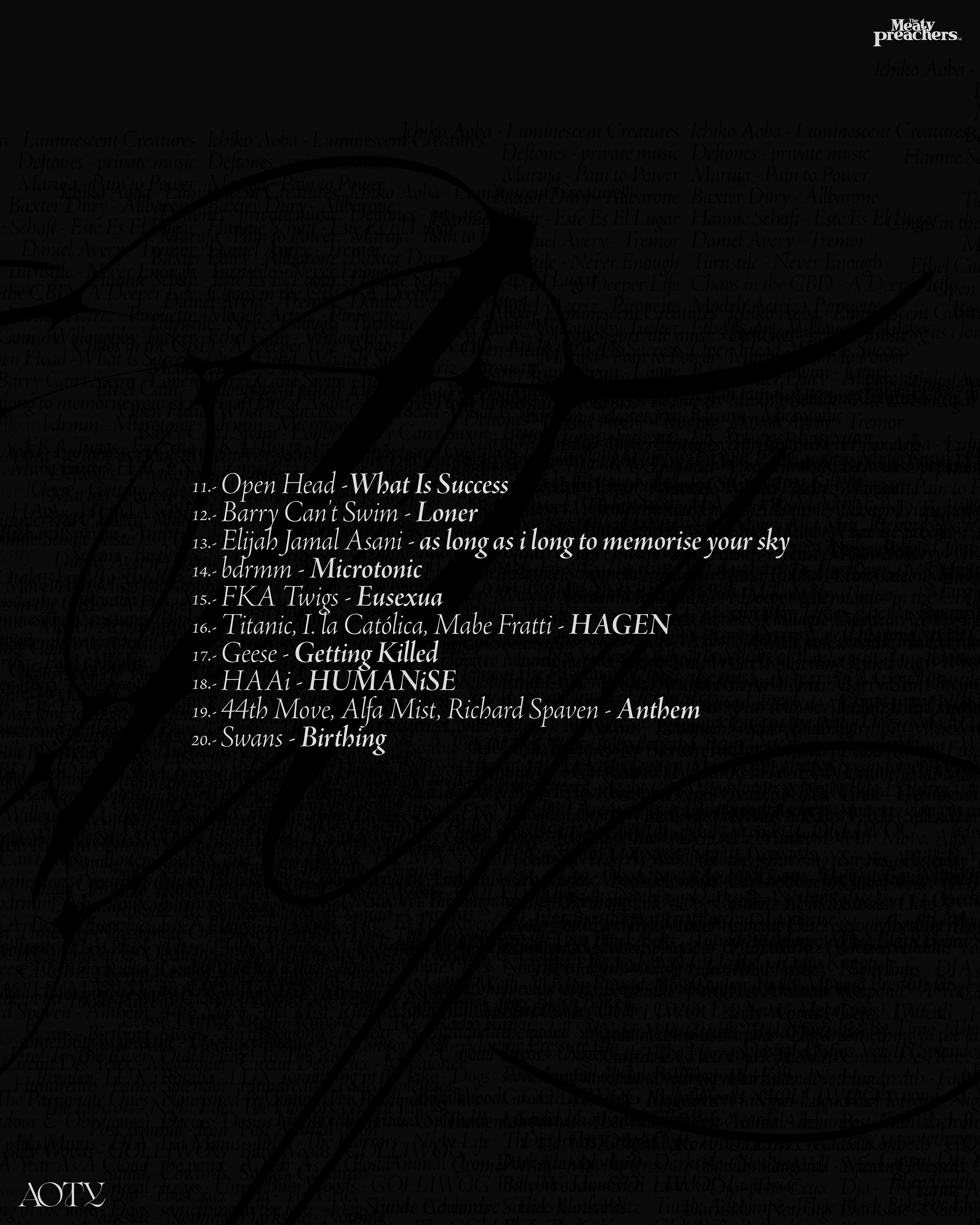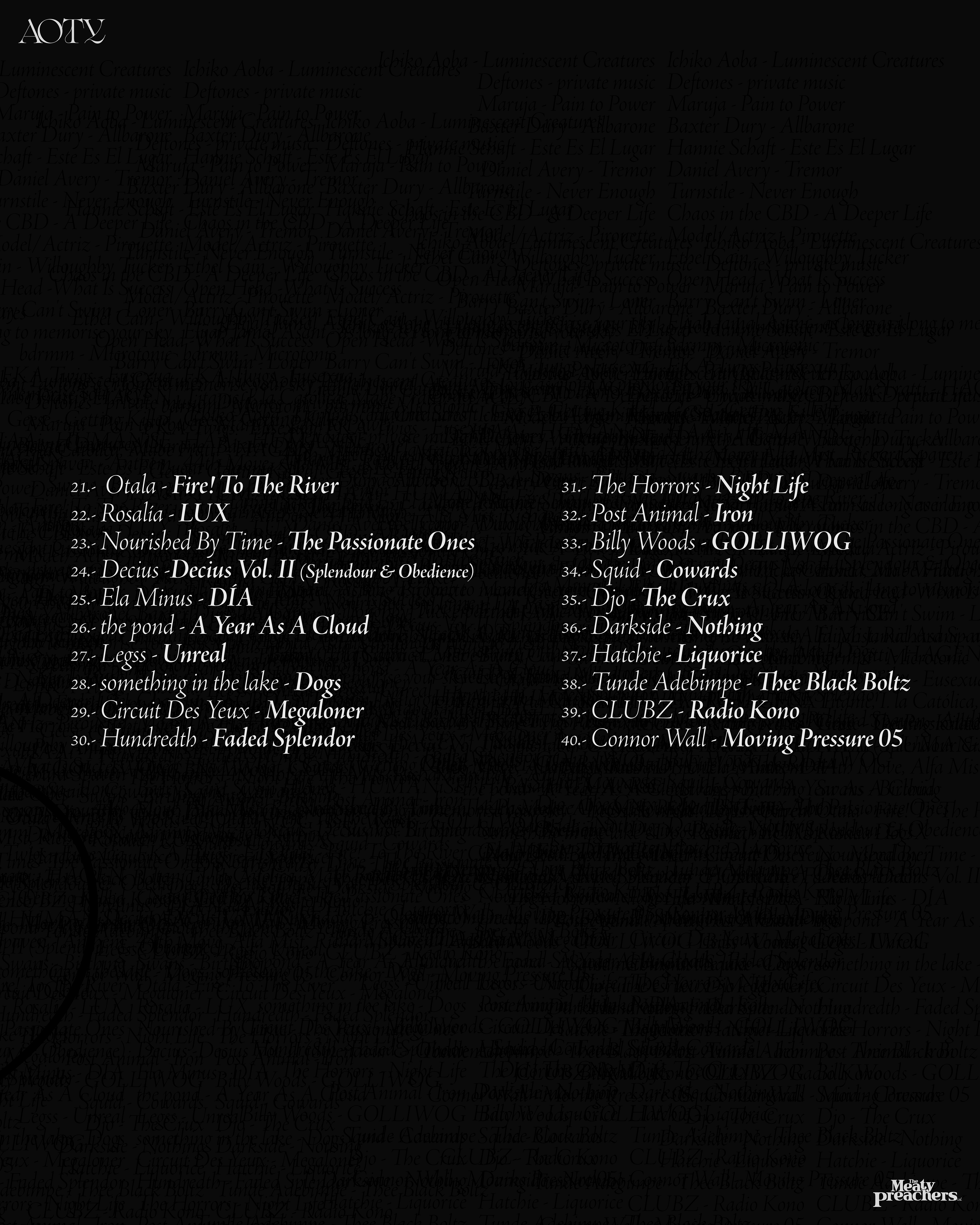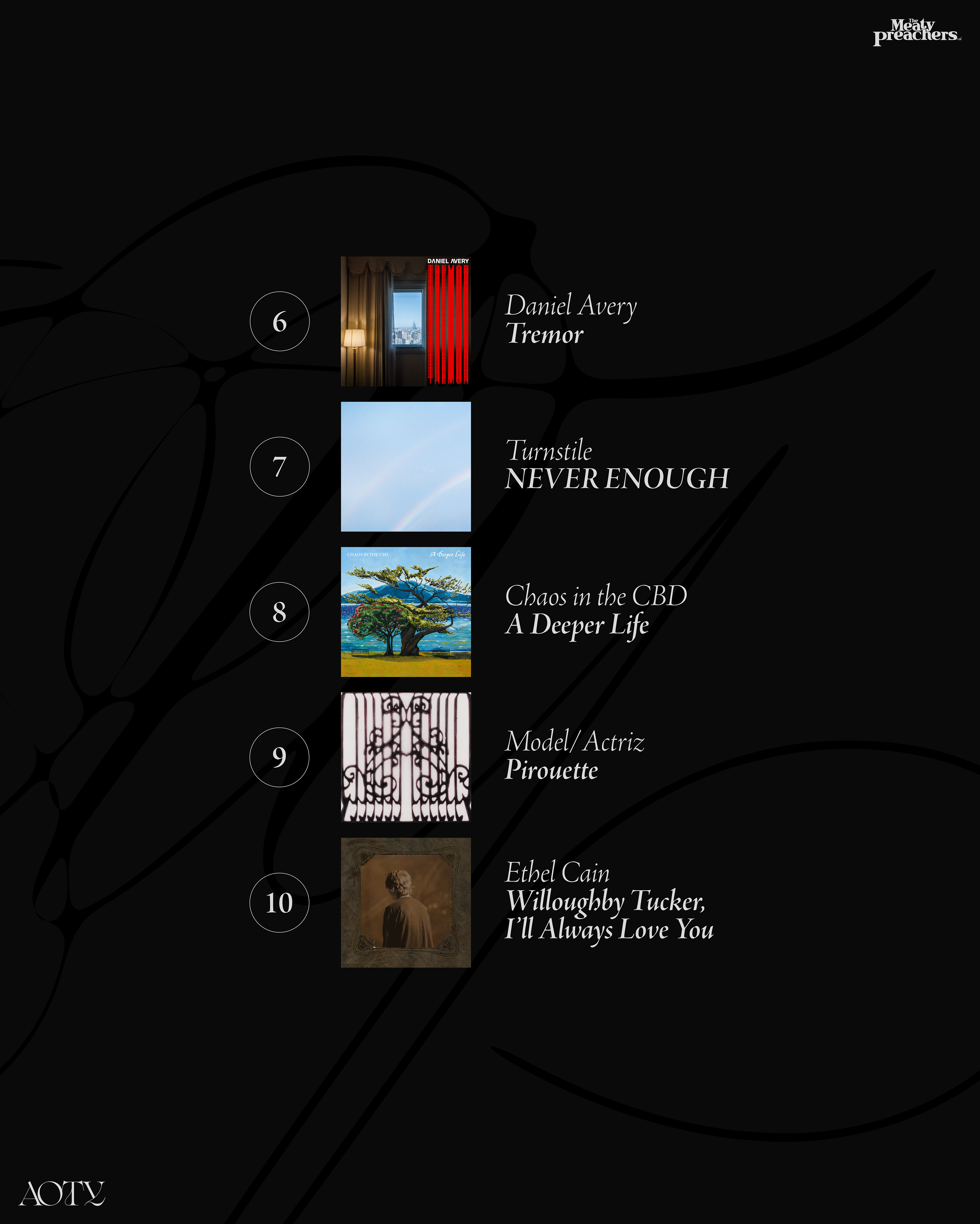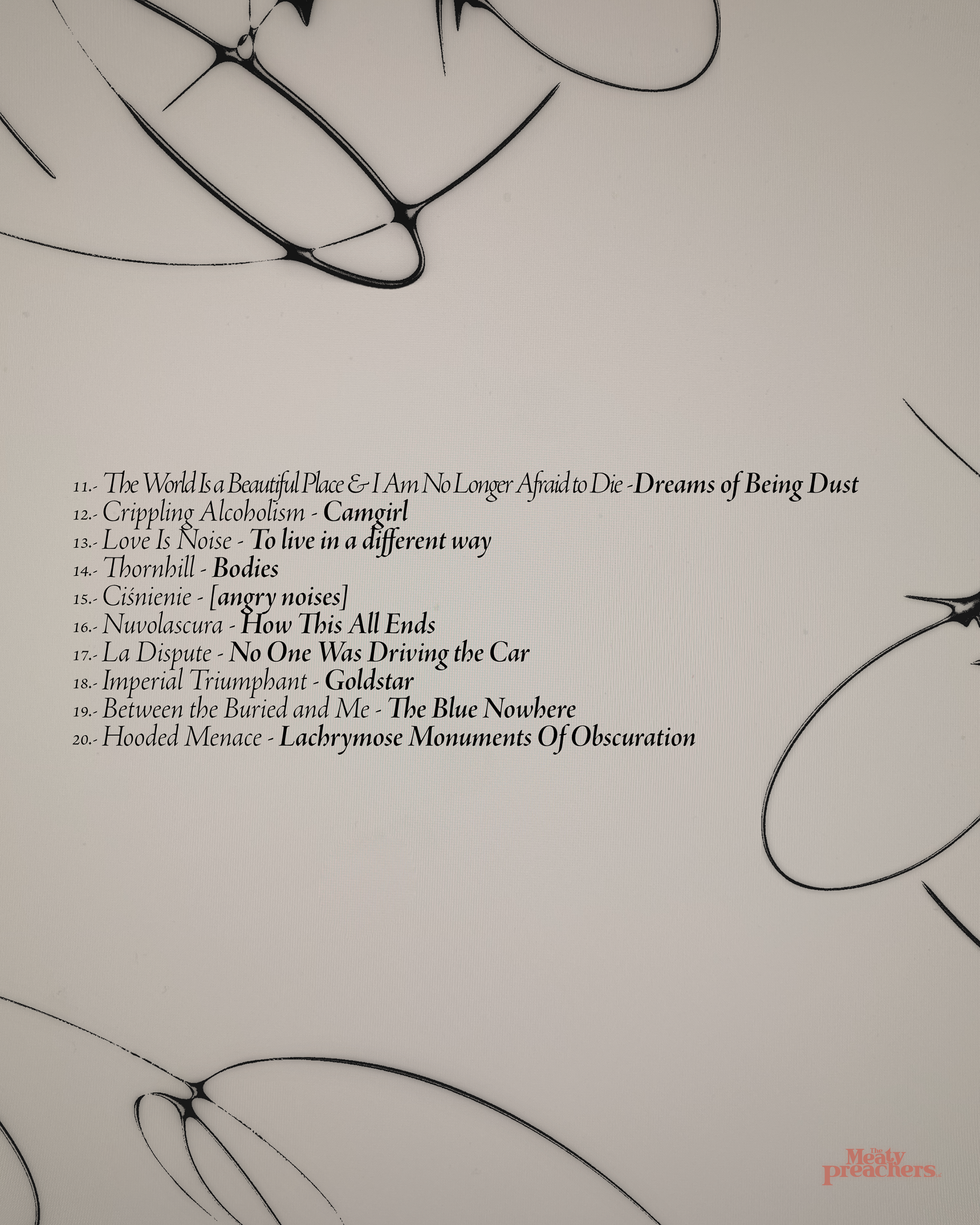 The objective was to design visuals that harmonize with the “sound” and “style” of The Meaty Preachers and how they select the music curated for their playlists. These visuals are characterized by a dark, moody tone, with a subtle touch of color. For the 2025 editions — Songs of The Year, Albums of The Year and Heavy Albums of The Year — the selections capture the records that shaped the year. The singles that lingered. The full-length projects that demanded to be played front to back. The heavier releases that pushed intensity without sacrificing depth.